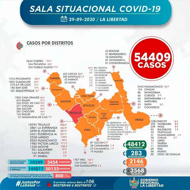 La Gerencia Regional de Salud de La Libertad, informa que al 29 de setiembre, se han procesado 155 066 (+ 775 ) pruebas entre rápidas y moleculares, resultando 54 409 (+ 438) casos positivos por Coronavirus en La Libertad, en las últimas 24 horas procesaron 775 pruebas, resultando 290 nuevos infectados por Covid-19,