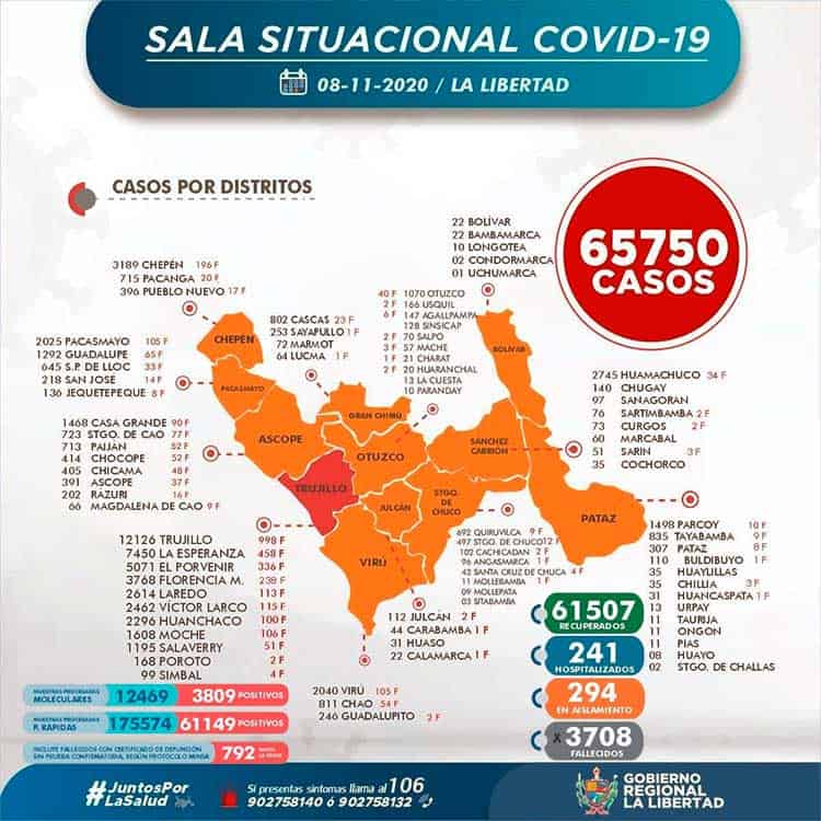 La Gerencia Regional de Salud de La Libertad, informa que al 08 de noviembre, se han procesado 188 043 (+ 450 ) pruebas entre rápidas y moleculares, resultando 65 750 (+ 126) casos positivos por Coronavirus en La Libertad, en las últimas 24 horas procesaron 450 pruebas, resultando 126 nuevos infectados por Covid-19,