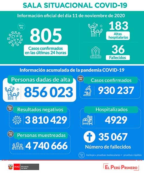 El Ministerio de Salud (Minsa) informa que hasta las 22:00 horas del día 11 de noviembre de 2020 se han procesado muestras para 4 740 666 personas por la COVID-19, obteniéndose, 930 237 casos confirmados y 3 810 429 negativos.