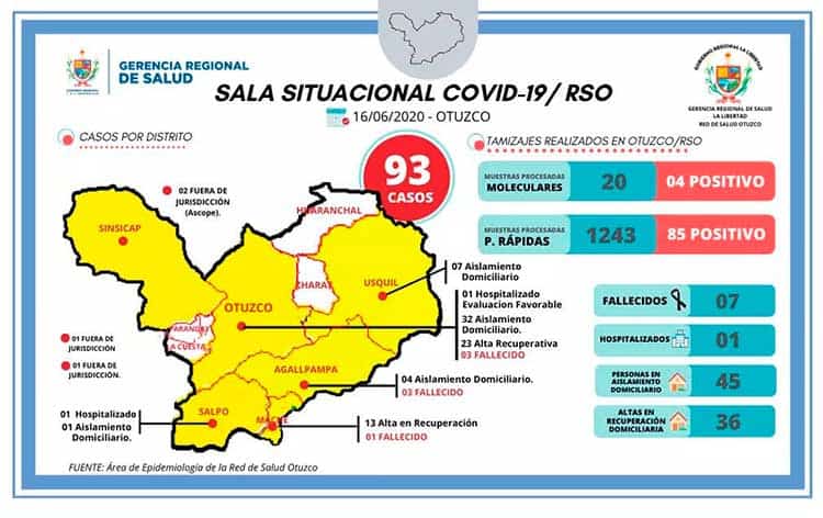 La Red de Salud de Otuzco, informa que al 16 de junio procesó 1263 pruebas, entre rápidas y moleculares, obteniéndose 93 infectados de coronavirus.