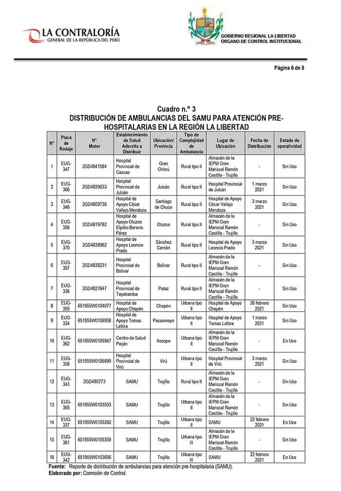 En la inspección realizada por la comisión de control, el pasado 4 de marzo, se verificó que 8 ambulancias totalmente equipadas (5 de tipo Rural tipo II, 1 Urbana tipo III y 2 Urbanas tipo II) permanecen en un ambiente a campo abierto en las instalaciones de Colegio Militar Gran Mariscal Ramón Castilla; mientras que otras dos están en uso del SAMU-Trujillo.