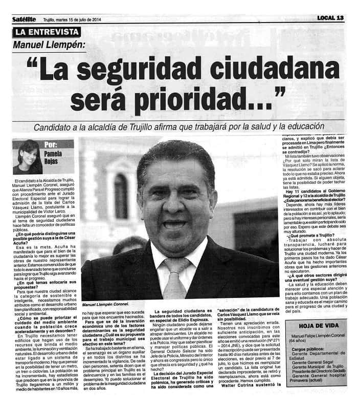 El candidato a la alcaldía de Trujillo por Alianza para el Progreso, Ing. Manuel LLempén Coronel, manifestó que la seguridad ciudadana será prioridad en su gestión y que una población sana y educada es el mejor camino para el progreso de una ciudad. A continuación reproducimos una entrevista concedida al Vespertino Satélite.