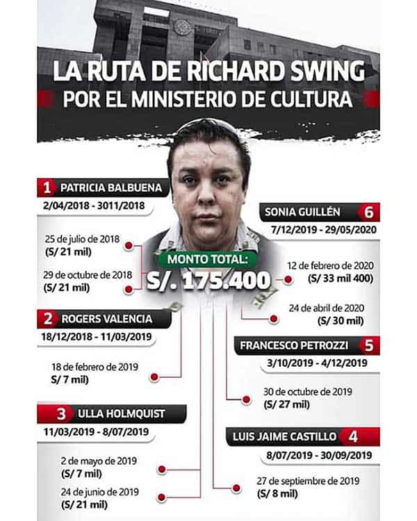 Este sería todos los contratos de Richard Cisneros (Richard Swing), con el Ministerio de Cultura, en diferentes gestiones de 6 ministros que pasaron por dicha cartera, iniciándose con la actual Viceministra del Ministerio de Desarrollo e Inclusión Social (MIDIS), Patricia Balbuena.
