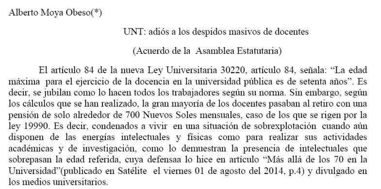 (Acuerdo de la Asamblea Estatutaria) El artículo 84 de la nueva Ley Universitaria 30220, artículo 84, señala: “La edad máxima para el ejercicio de la docencia en la universidad pública es de setenta años”. Es decir, se jubilan como lo […]