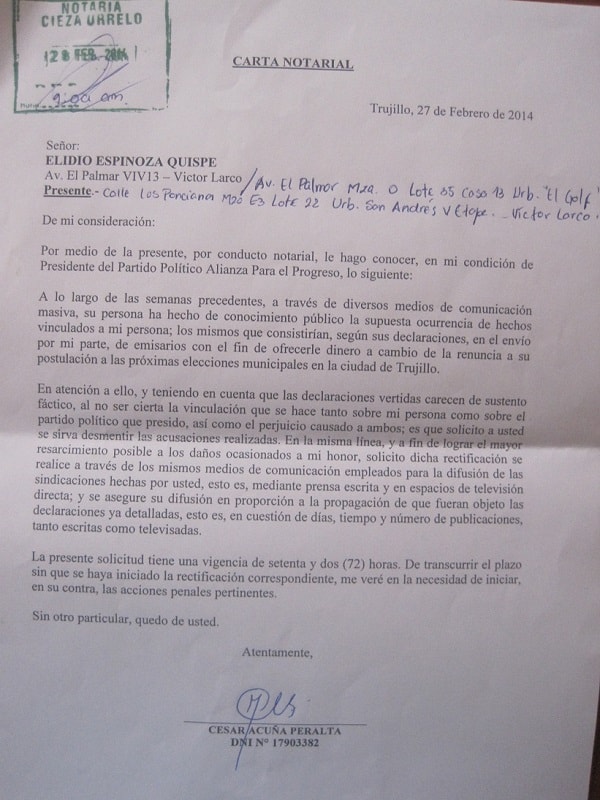 César Acuña Peralta, presidente del partido Alianza Para el Progreso (APP), emplazó mediante carta notarial al oficial en retiro de la Policía Nacional del Perú (PNP) Elidio Espinoza Quispe, para que en un plazo de 72 horas rectifique declaraciones públicas respecto al envió de emisarios “con el fin de ofrecerle dinero a cambio de la renuncia a su postulación a las próximas elecciones municipales en la ciudad de Trujillo”.