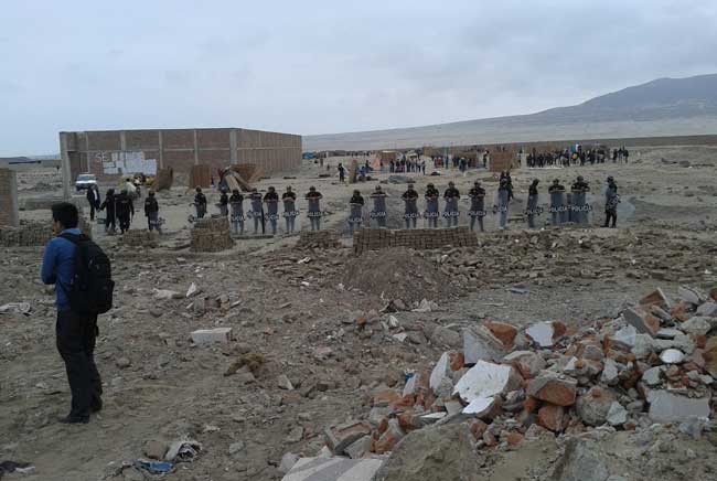 Un fuerte cordón policial se formó para proteger la propiedad del Proyecto Chavimochic ante las pretensiones de los invasores de retornar al terreno.