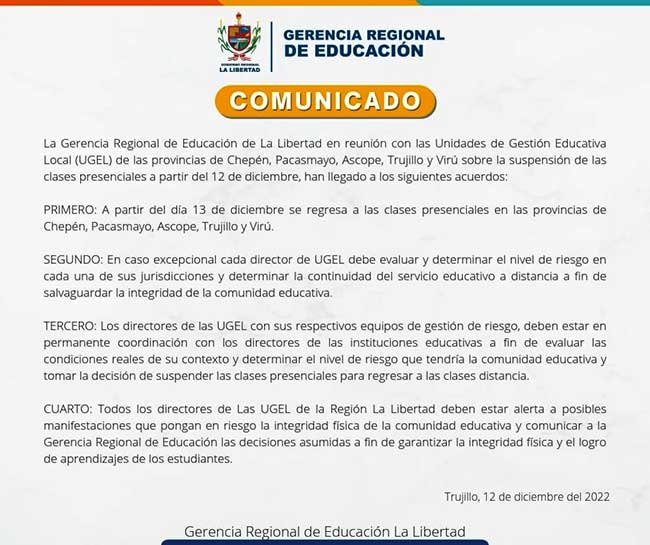 La Gerencia Regional de Educación de La Libertad comunicó que las clases presenciales se retomarán este martes 13 de diciembre en las provincias de Chepén, Pacasmayo, Ascope, Trujillo y Virú.
