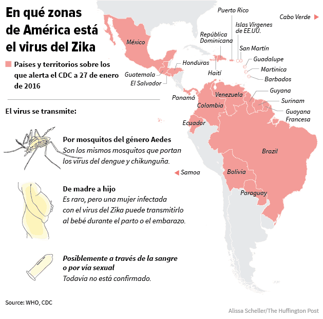 Según la Organización Panamericana de la Salud, 20 países ya han reportado la detección del zika en su territorio: Barbados, Bolivia, Brasil, Colombia, Ecuador, El Salvador, Guadalupe, Guatemala, Guyana, la Guayana Francesa, Haití, Honduras, Martinica, México, Panamá, Paraguay, Puerto Rico, la isla de San Martín, Surinam y Venezuela.