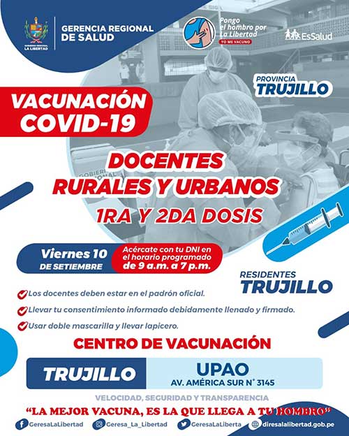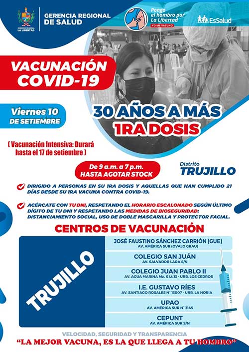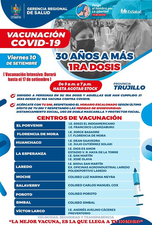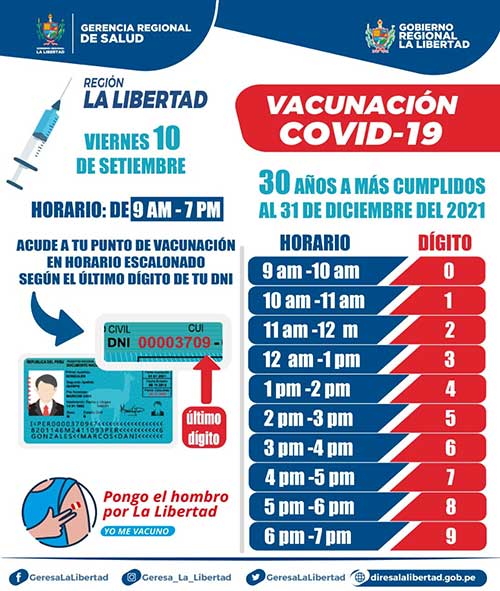 Este viernes 10 de setiembre sigue la gran vacunación en los diferentes puntos de vacunación. Siempre teniendo en cuenta el último dígito de su DNI. Recuerden la vacunación es para las personas de 30 años a más, cumplidos al 31 de diciembre del 2021 en su 1ra. Dosis. La cita es de 9 am. Hasta las 7 pm.