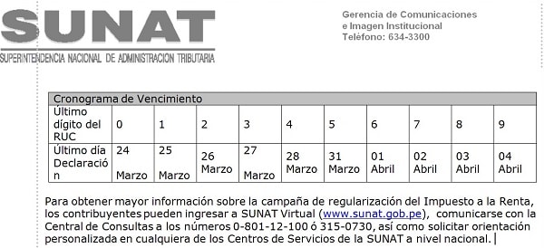 La SUNAT aprobó el cronograma de vencimientos de acuerdo con el último dígito del número de RUC de los contribuyentes, que establece el plazo máximo para cumplir con la presentación de la declaración. Lo recomendable es hacer antes de estas fechas que son las definitivas para cumplir con esta obligación.