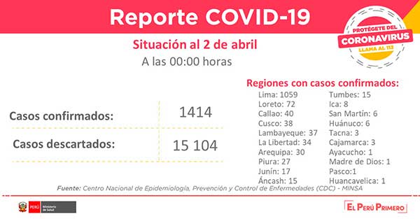 El Presidente Martín Vizcarra, anunció que ya se han hecho 16518 pruebas. De ellas, 1414 fueron dados positivos y Los casos descartados son 15 104., o sea que un aumento de 91 casos.