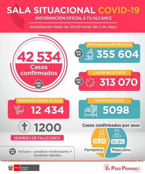 Con relación al procesamiento de las muestras (moleculares y serológicas o rápidas) por coronavirus Covid-19, el Ministerio de Salud (Minsa) informa que al 02 de mayo de 2020 se han procesado muestras para 355 604 personas por Covid-19, obteniéndose, hasta las 00:00h, 42 534 resultados positivos y 313 070 negativos.