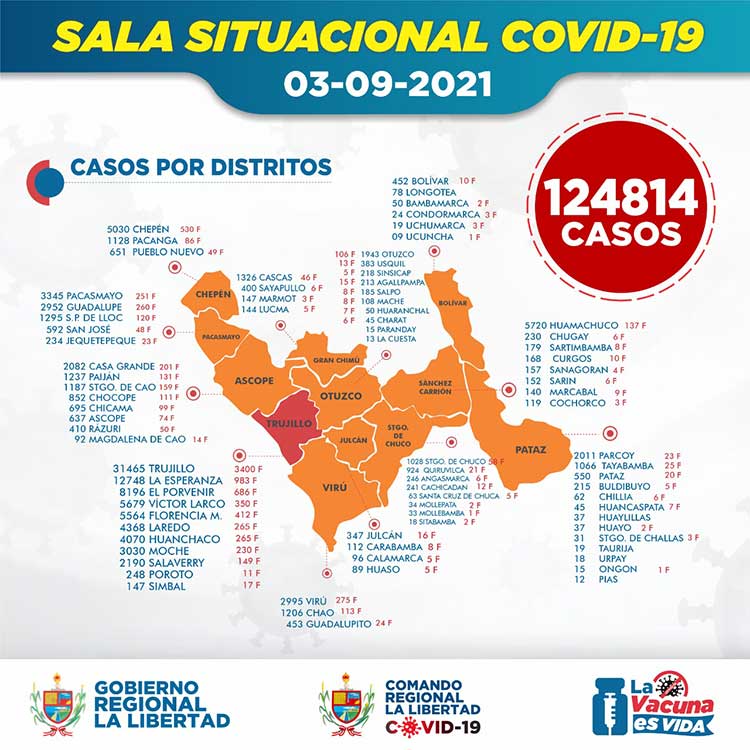 La Gerencia Regional de Salud de La Libertad , informa que al 03 de setiembre, se han procesado 396 151 (+512) pruebas entre rápidas y moleculares, resultando 124 814 (+41) casos positivos por Coronavirus en La Libertad , en las últimas 24 horas procesaron 512 pruebas , resultando 41 nuevos infectados por Covid-19.