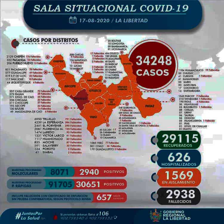 La Gerencia Regional de Salud de La Libertad, informa que al 16 de agosto, se han procesado 99776 (+ 555) pruebas entre rápidas y moleculares, resultando 34248 (+ 205) casos positivos por Coronavirus en La Libertad, en las últimas 24 horas procesaron 555 pruebas, resultando 205 nuevos infectados por Covid-19,