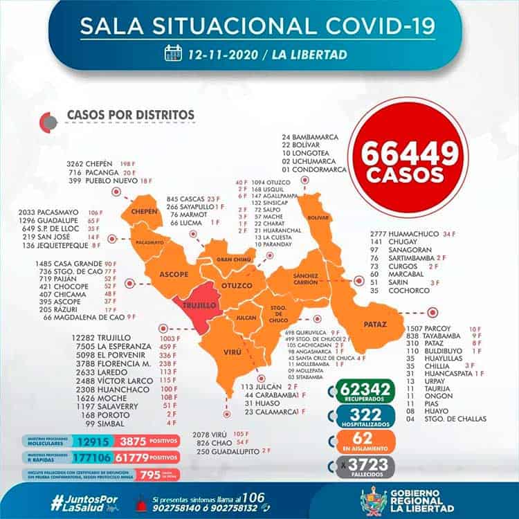 La Gerencia Regional de Salud de La Libertad, informa que al 12 de noviembre, se han procesado 190 021 (+ 538 ) pruebas entre rápidas y moleculares, resultando 66 449 (+ 206) casos positivos por Coronavirus en La Libertad, en las últimas 24 horas procesaron 538 pruebas, resultando 206 nuevos infectados por Covid-19,