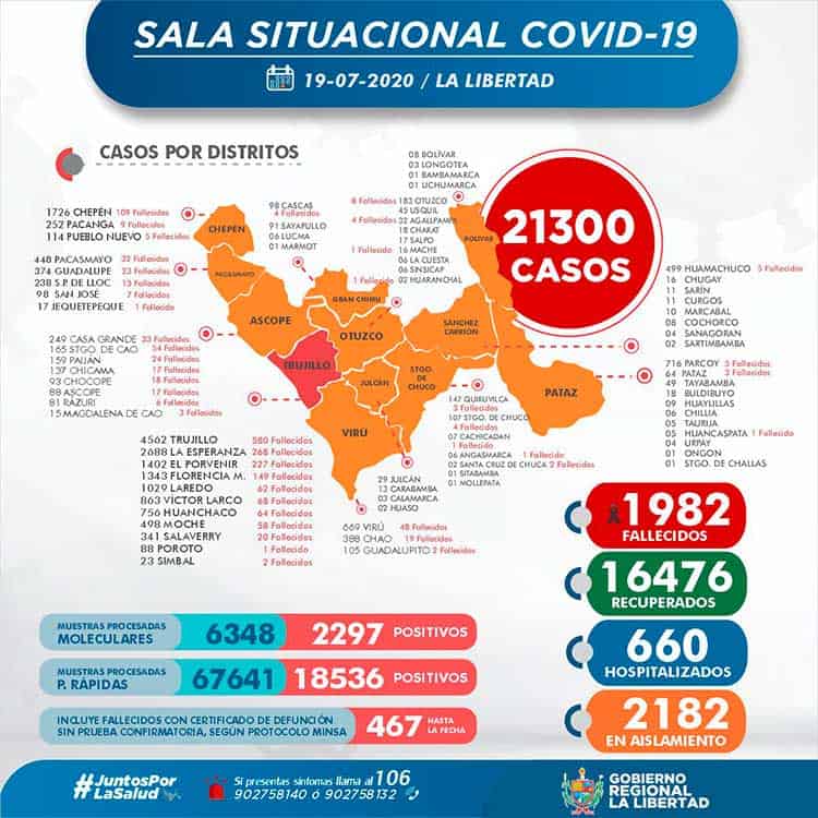 La Gerencia Regional de Salud de La Libertad, en su reporte al 19 de julio, informó que se han procesado 73989 (+ 784) pruebas entre rápidas y moleculares, resultando 21300 (+ 430) casos positivos por Coronavirus en La Libertad, en las últimas 24 horas procesaron 784 pruebas, resultando 430 nuevos infectados por Covid-19.