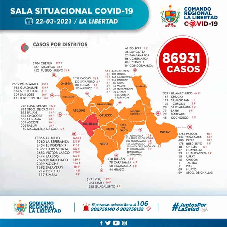 La Gerencia Regional de Salud de La Libertad , informa que al 22 de marzo, se han procesado 252 559 (+ 257) pruebas entre rápidas y moleculares, resultando 86 931 (+ 237) casos positivos por Coronavirus en La Libertad , en las últimas 24 horas procesaron 257 pruebas , resultando 237 nuevos infectados por Covid-19.