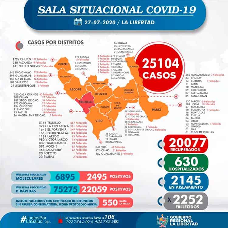 La Gerencia Regional de Salud de La Libertad, informa que al 27 de julio, que se han procesado 82170 (+478) pruebas entre rápidas y moleculares, resultando 25104 (+ 270) casos positivos por Coronavirus en La Libertad, en las últimas 24 horas procesaron 478 pruebas, resultando 270 nuevos infectados por Covid-19.