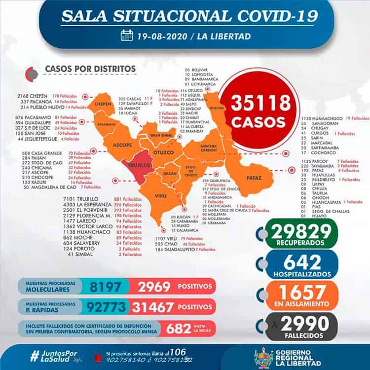 La Gerencia Regional de Salud de La Libertad, informa que al 19 de agosto, se han procesado 100970 (+ 749) pruebas entre rápidas y moleculares, resultando 35118 (+ 405 ) casos positivos por Coronavirus en La Libertad, en las últimas 24 horas procesaron 749 pruebas, resultando 405 nuevos infectados por Covid-19,