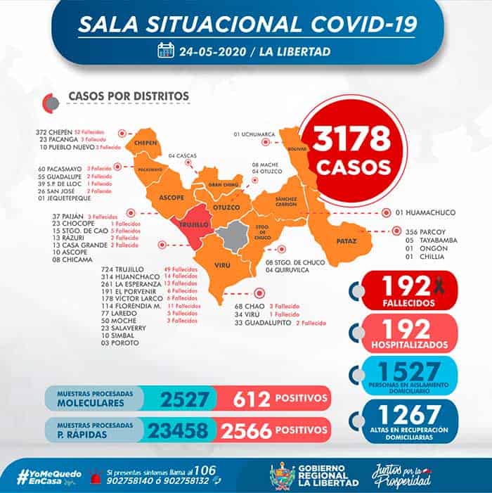 La Gerencia Regional de Salud de La Libertad, informa que al 24 de mayo, se ha procesado 25985 (+1309) pruebas entre rápidas y moleculares, resultando 3178 (+155) casos positivos (contagiados) de Coronavirus en La Libertad,