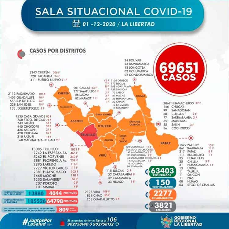 La Gerencia Regional de Salud de La Libertad, informa que al 01 de diciembre, se han procesado 199 406 (+ 327) pruebas entre rápidas y moleculares, resultando 69 651 (+ 116) casos positivos por Coronavirus en La Libertad, en las últimas 24 horas procesaron 327 pruebas, resultando 116 nuevos infectados por Covid-19.