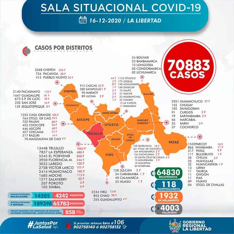 La Gerencia Regional de Salud de La Libertad, informa que al 17 de diciembre, se han procesado 204 242 (+ 339) pruebas entre rápidas y moleculares, resultando 70 968 (+ 85) casos positivos por Coronavirus en La Libertad, en las últimas 24 horas procesaron 339 pruebas, resultando 85 nuevos infectados por Covid-19.