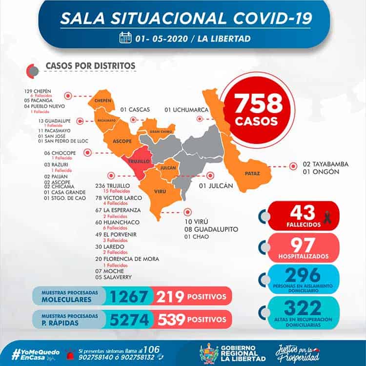 La Gerencia Regional de Salud de La Libertad, informó que a la fecha se han procesado 6541 muestras entre moleculares y rápidas, obteniéndose 758 confirmados por COVID-19.