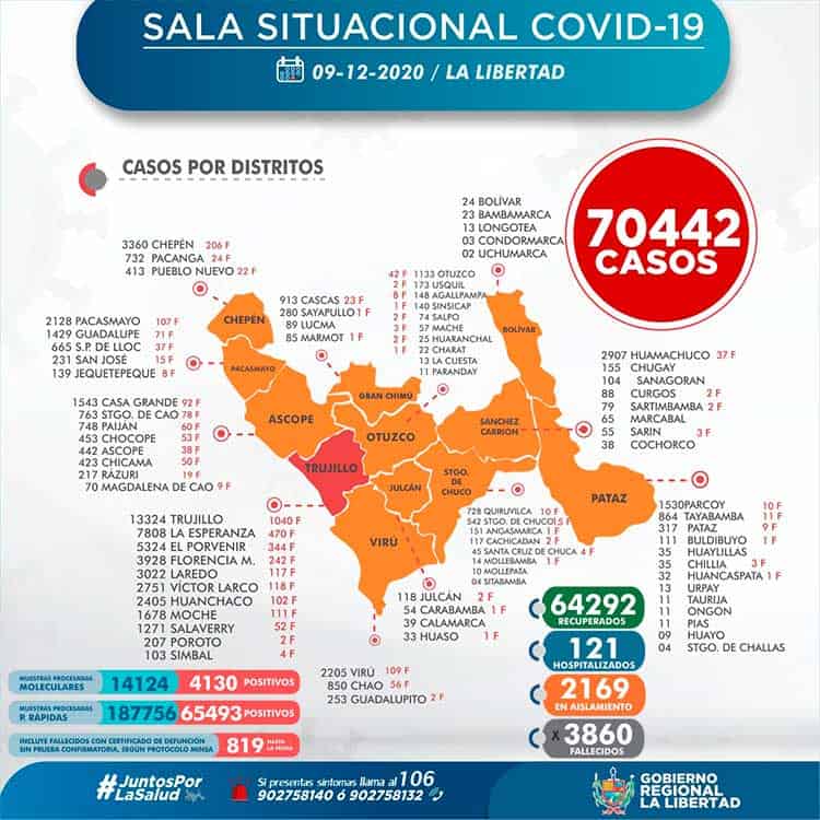 La Gerencia Regional de Salud de La Libertad, informa que al 09 de diciembre, se han procesado 201 880 (+ 236) pruebas entre rápidas y moleculares, resultando 70 442 (+ 78) casos positivos por Coronavirus en La Libertad, en las últimas 24 horas procesaron 236 pruebas, resultando 78 nuevos infectados por Covid-19.