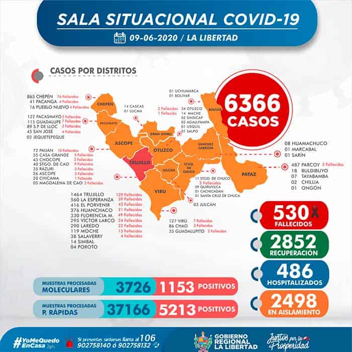 La Gerencia Regional de Salud de La Libertad, en su reporte de hoy 09 de junio, reportó que a la fecha se han procesado 40892 (+ 300) pruebas entre rápidas y moleculares, resultando  6366  (+106) infectados por Coronavirus en La Libertad, en las últimas 24 horas procesaron 300 pruebas, resultando 106 nuevos infectados por Covid-19.