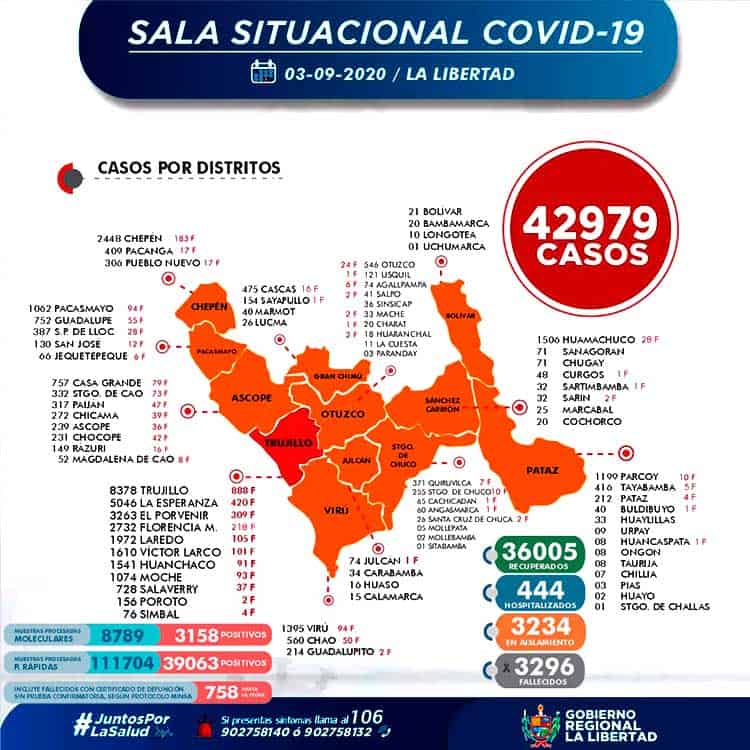 La Gerencia Regional de Salud de La Libertad, informa que al 03 de setiembre, se han procesado 120 493 (+ 1308) pruebas entre rápidas y moleculares, resultando 42 979 (+ 491 ) casos positivos por Coronavirus en La Libertad, en las últimas 24 horas procesaron 1308 pruebas, resultando 491 nuevos infectados por Covid-19,