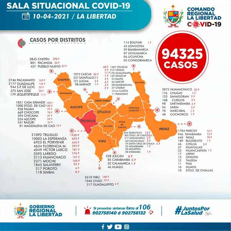 La Gerencia Regional de Salud de La Libertad , informa que al 10 de abril, se han procesado 266 674 (+ 1027) pruebas entre rápidas y moleculares, resultando 94 325 (+ 872) casos positivos por Coronavirus en La Libertad , en las últimas 24 horas procesaron 1027 pruebas , resultando 872 nuevos infectados por Covid-19.