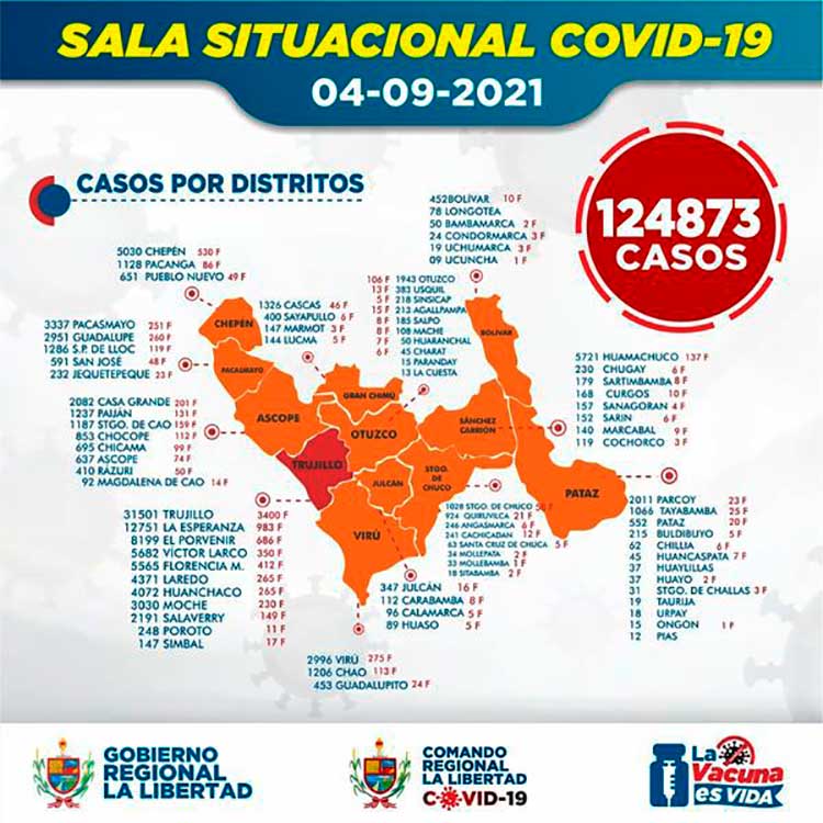 La Gerencia Regional de Salud de La Libertad , informa que al 04 de setiembre, se han procesado 396 527 (+376) pruebas entre rápidas y moleculares, resultando 124 873 (+49) casos positivos por Coronavirus en La Libertad , en las últimas 24 horas procesaron 376 pruebas , resultando 49 nuevos infectados por Covid-19.