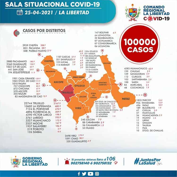 La Gerencia Regional de Salud de La Libertad , informa que al 25 de abril, se han procesado 280 508 (+ 654) pruebas entre rápidas y moleculares, resultando 100 000 (+ 313) casos positivos por Coronavirus en La Libertad , en las últimas 24 horas procesaron 654 pruebas , resultando 313 nuevos infectados por Covid-19.