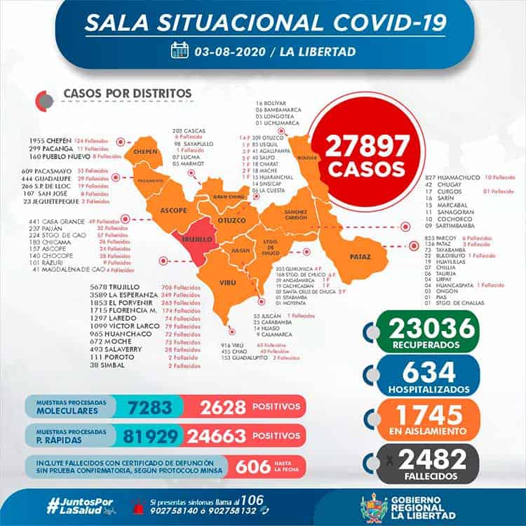 La Gerencia Regional de Salud de La Libertad, informa que al 03 de agosto, se han procesado 89212 (+888) pruebas entre rápidas y moleculares, resultando 27897 (+ 126) casos positivos por Coronavirus en La Libertad, en las últimas 24 horas procesaron 888 pruebas, resultando 126 nuevos infectados por Covid-19.