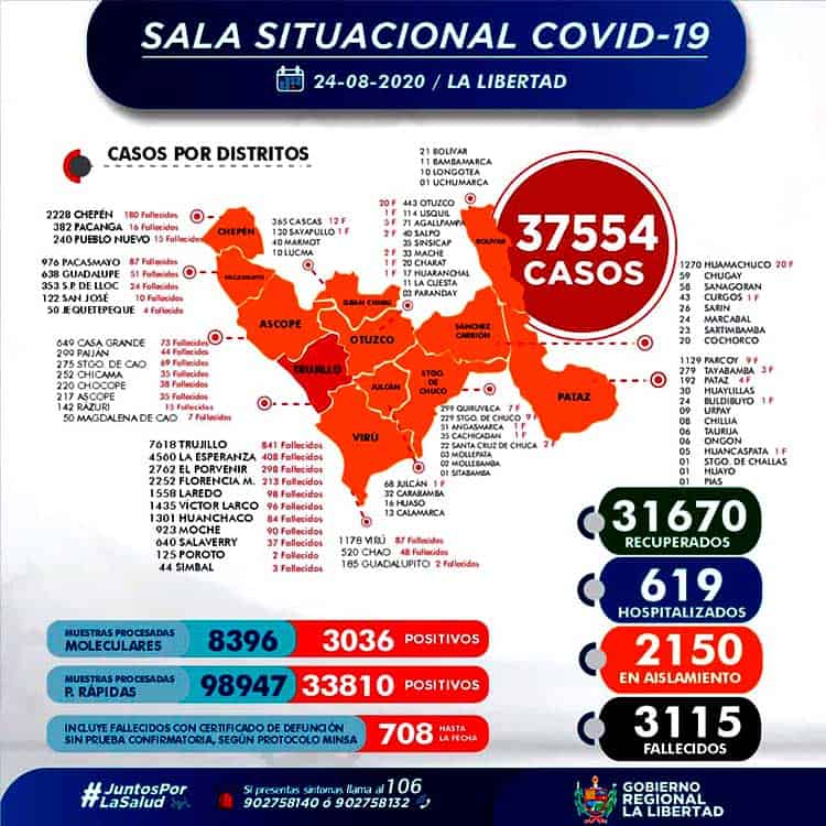 La Gerencia Regional de Salud de La Libertad, informa que al 24 de agosto, se han procesado 107 343 (+ 279) pruebas entre rápidas y moleculares, resultando 37 554 (+ 163 ) casos positivos por Coronavirus en La Libertad, en las últimas 24 horas procesaron 279 pruebas, resultando 163 nuevos infectados por Covid-19,
