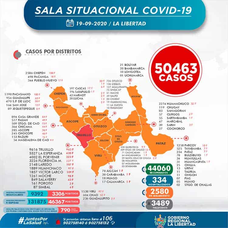 La Gerencia Regional de Salud de La Libertad, informa que al 19 de setiembre, se han procesado 141 267 (+ 2242 ) pruebas entre rápidas y moleculares, resultando 50 463 (+ 471) casos positivos por Coronavirus en La Libertad, en las últimas 24 horas procesaron 2242 pruebas, resultando 471 nuevos infectados por Covid-19,