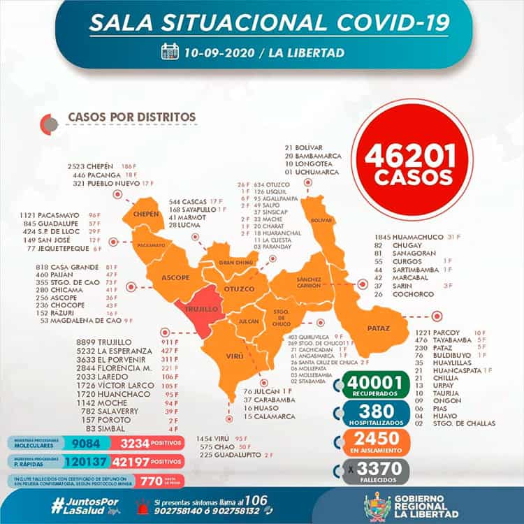 La Gerencia Regional de Salud de La Libertad, informa que al 10 de setiembre, se han procesado 129 221 (+ 1125) pruebas entre rápidas y moleculares, resultando 46 201 (+ 487 ) casos positivos por Coronavirus en La Libertad, en las últimas 24 horas procesaron 1125 pruebas, resultando 487 nuevos infectados por Covid-19,