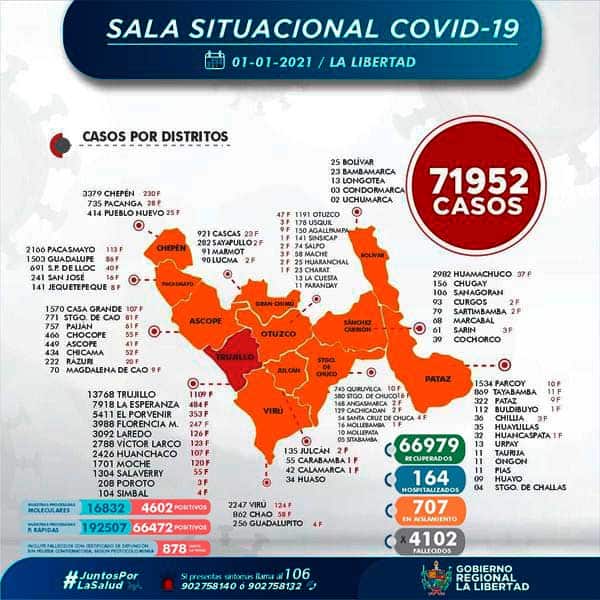 La Gerencia Regional de Salud de La Libertad, informa que al 01 de enero, se han procesado 209 339 (+ 250) pruebas entre rápidas y moleculares, resultando 71 952 (+ 101) casos positivos por Coronavirus en La Libertad, en las últimas 24 horas procesaron 250 pruebas, resultando 101 nuevos infectados por Covid-19.