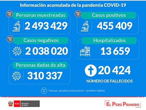 El Ministerio de Salud (Minsa) informa que hasta las 00:00 horas del día 6 de agosto de 2020 se han procesado muestras para 2 493 429 personas por la COVID-19, obteniéndose, 455 409 resultados positivos y 2 038 020 negativos.