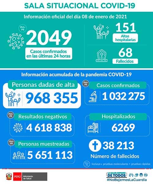 El Ministerio de Salud (Minsa) informa que hasta las 22:00 horas del día 8 de enero de 2021 se han procesado muestras para 5 651 113 personas por la COVID-19, obteniéndose, 1 032 275 casos confirmados y 4 618 838 negativos.