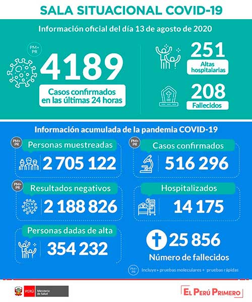 El Ministerio de Salud (Minsa) informa que hasta las 00:00 horas del día 14 de agosto de 2020 se han procesado muestras para 2 705 122 personas por la COVID-19, obteniéndose, 516 296 casos confirmados y 2 188 826 negativos.