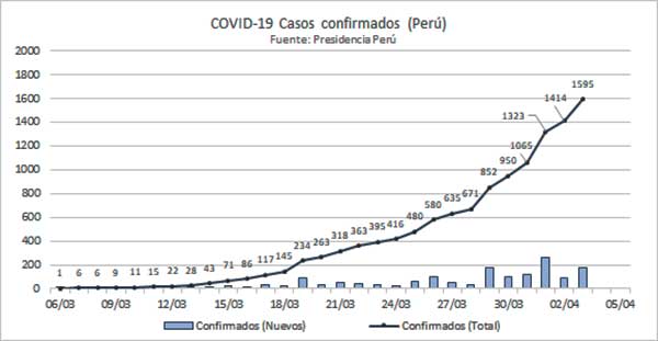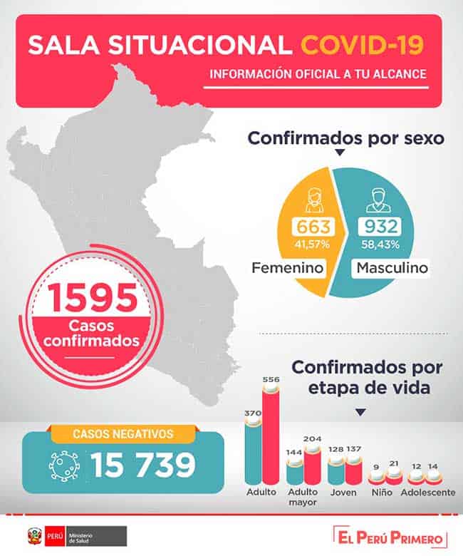En el día 19 de aislamiento, el Presidente Martín Vizcarra, informó que la cantidad de pruebas ascendió a 17,334 pruebas. Entre ellas, 1595 casos son positivos de Covid-19, o sea 181 más en relación a las últimas 24 horas.