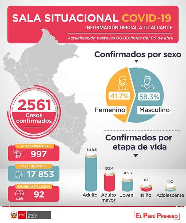 El Presidente Martín Vizcarra, informó que el número de contagiados con coronavirus en el Perú se elevó a 2561, 280 nuevos contagios respecto al día anterior. Esta cifra se obtuvo tras el procesamiento de 20 414 muestras, de las cuales 17 853 resultaron negativas.