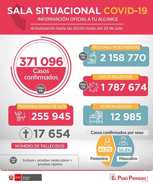 El Ministerio de Salud (Minsa) informa que al 23 de julio de 2020 se han procesado muestras para 2’158,770 personas por Covid-19, obteniéndose, hasta las 00:00h, 371,096 resultados positivos y 1’787,674 negativos.