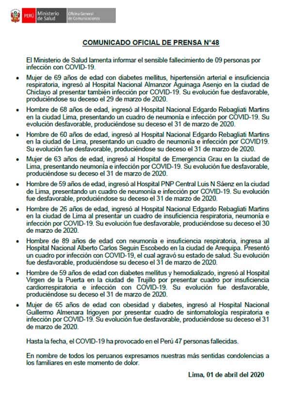 El Ministerio de Salud reportó esta noche nueve fallecidos, durante los últimos días, lo que eleva el número total de muertes por COVID-19 a 47.