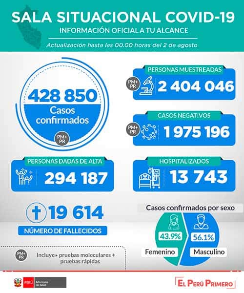 El Ministerio de Salud (Minsa) informa que hasta las 00:00 horas del 2 de agosto de 2020 se han procesado 2 404 046 de muestras para Covid-19, obteniéndose 428 850 resultados positivos y 1 975 196 negativos.