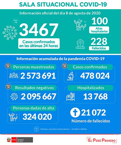 El Ministerio de Salud (Minsa) informa que hasta las 00:00 horas del día 9 de agosto de 2020 se han procesado muestras para 2 573 691 personas por la COVID-19, obteniéndose, 478 024 resultados positivos y 2 095 667 negativos.
