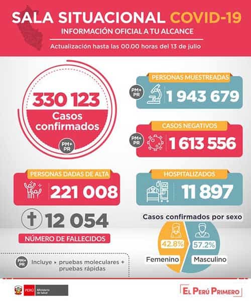 El Ministerio de Salud (Minsa) informa que al13 de julio de 2020 se han procesado muestras para 1’943,679 personas por Covid-19, obteniéndose, hasta las 00:00h, 330,123 resultados positivos y 1 613,556 negativos.