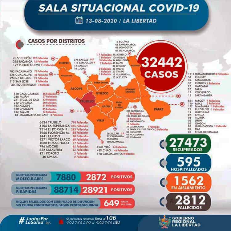 La Gerencia Regional de Salud de La Libertad, informa que al 13 de agosto, se han procesado 96594 (+ 704) pruebas entre rápidas y moleculares, resultando 32442 (+ 579) casos positivos por Coronavirus en La Libertad, en las últimas 24 horas procesaron 844 pruebas, resultando 579 nuevos infectados por Covid-19.
