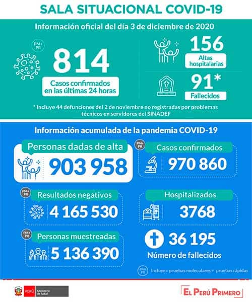E Ministerio de Salud (Minsa) informa que hasta las 22:00 horas del día 3 de diciembre de 2020 se han procesado muestras para 5 136 390 personas por la COVID-19, obteniéndose, 970 860 casos confirmados y 4 165 530 negativos.